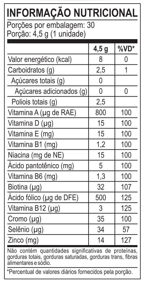 (vitamina E), nicotinamida (niacina), sulfato de zinco, pantotenato de cálcio (ácido pantotênico), cloridrato de piridoxina (vitamina B6), cloridrato de tiamina (vitamina B1), acetato de retinol (vitamina A), ácido fólico, selenito de sódio, picolinato de cromo, biotina, colecalciferol (vitamina D), cianocobalamina (vitamina B12), triglicerídeos de cadeia média, agentes de massa maltitol e sorbitol, gelificantes gelatina e pectina, acidulantes ácido cítrico e ácido lático, aroma idêntico ao natural de morango, corante carmim, glaceante cera de carnaúba, conservador sorbato de potássio, antiumectante talco, sequestrante EDTA dissódico e edulcorante sucralose.