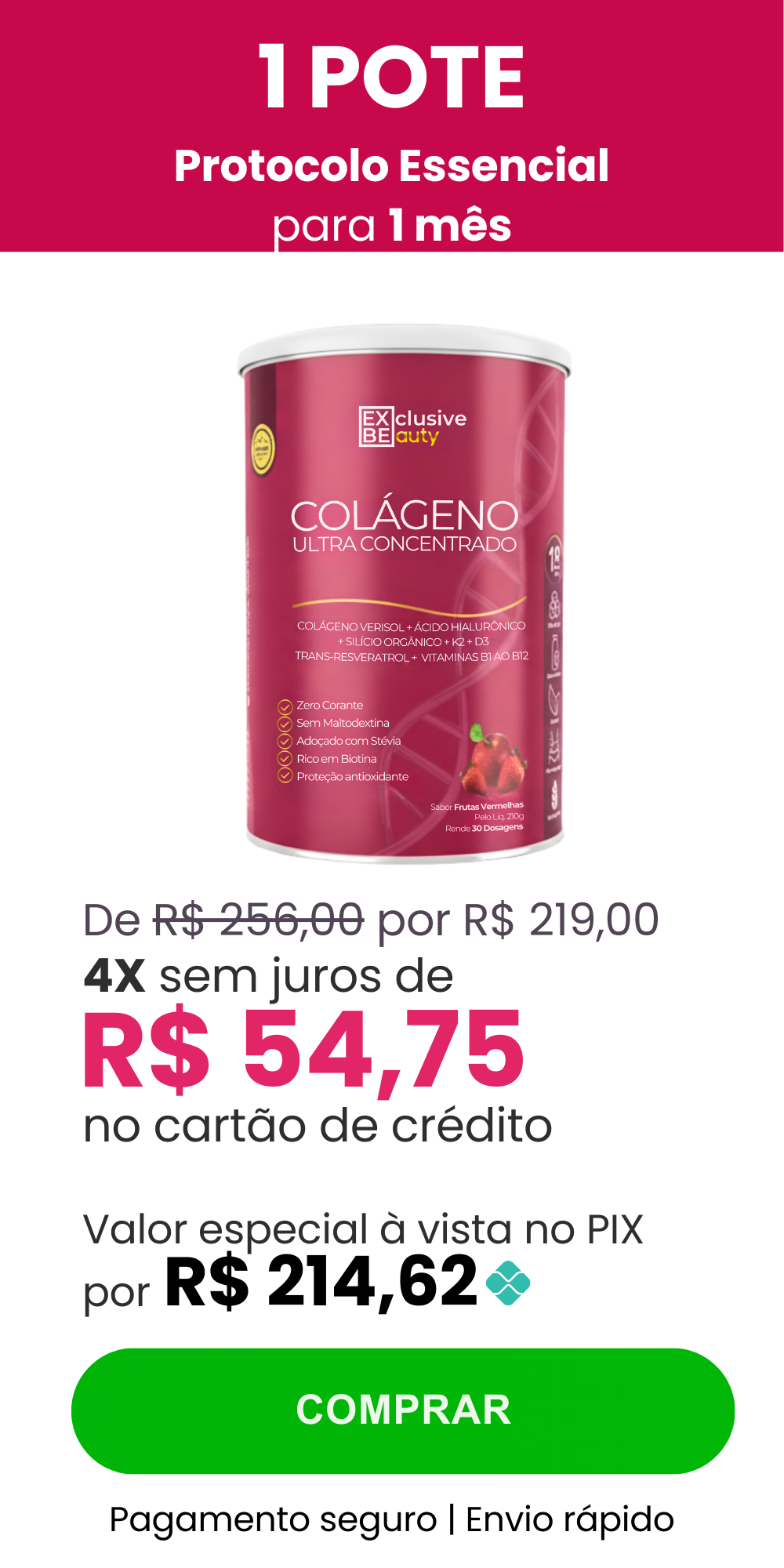 Enquanto outros colágenos diluem seus ingredientes com maltodextrina para parecerem maiores, nós concentramos só o que funciona. Por isso nosso pote é de 210g (e não 300g como os demais) e rende 30 dosagens.