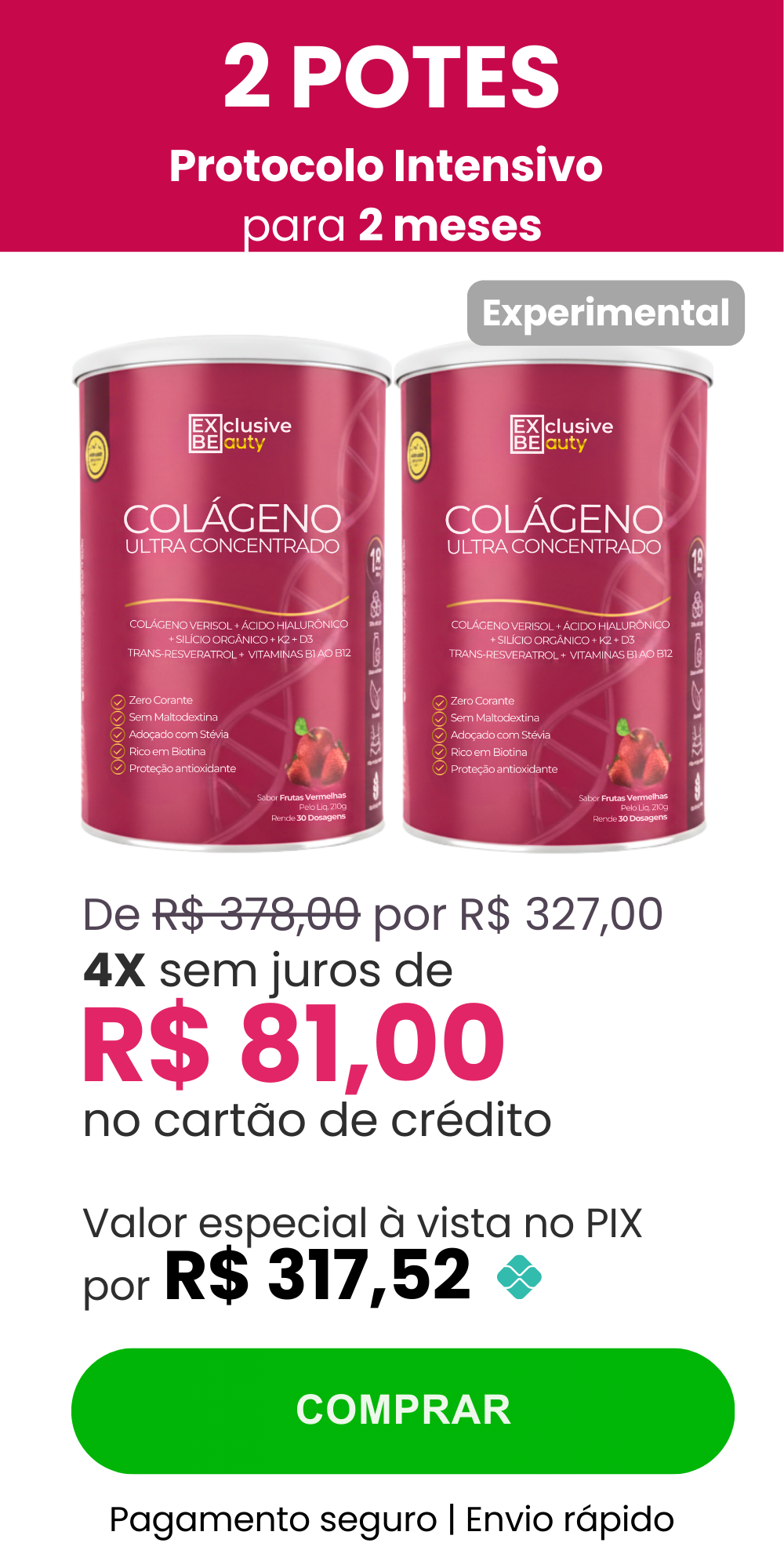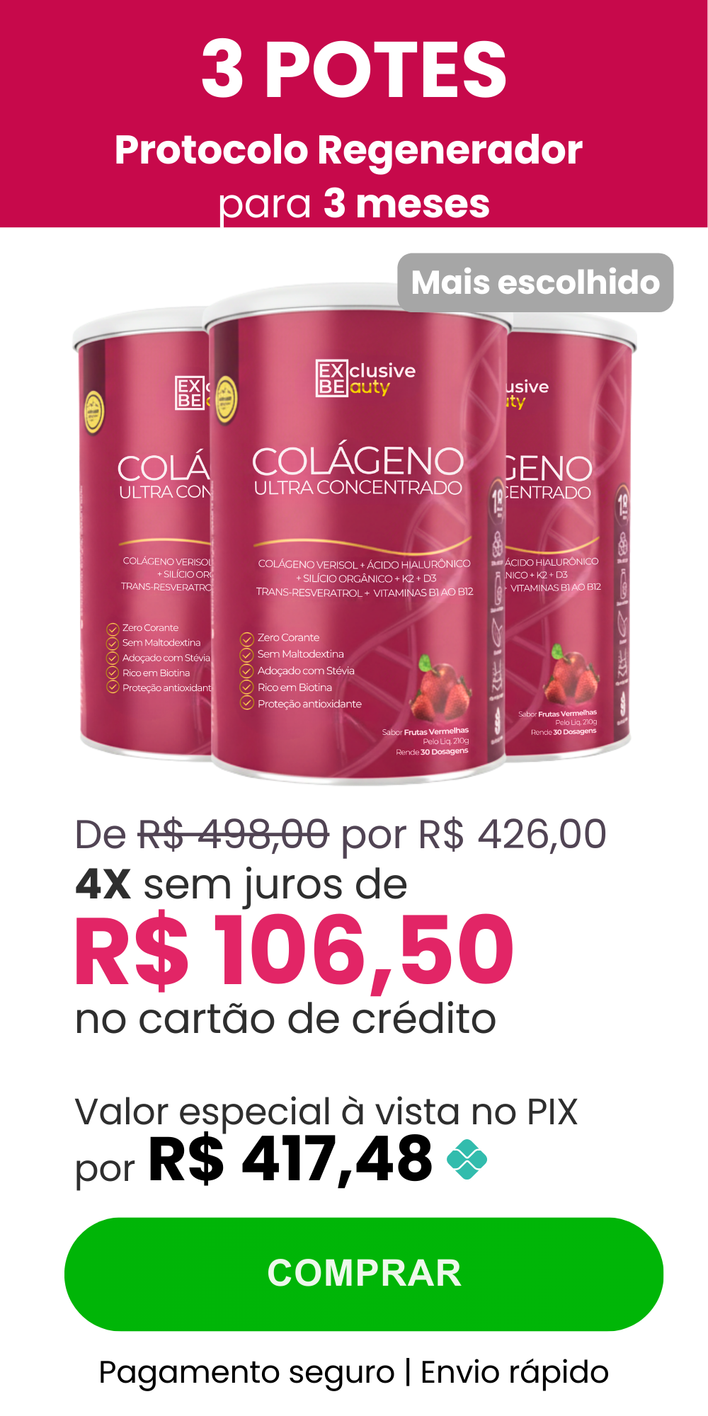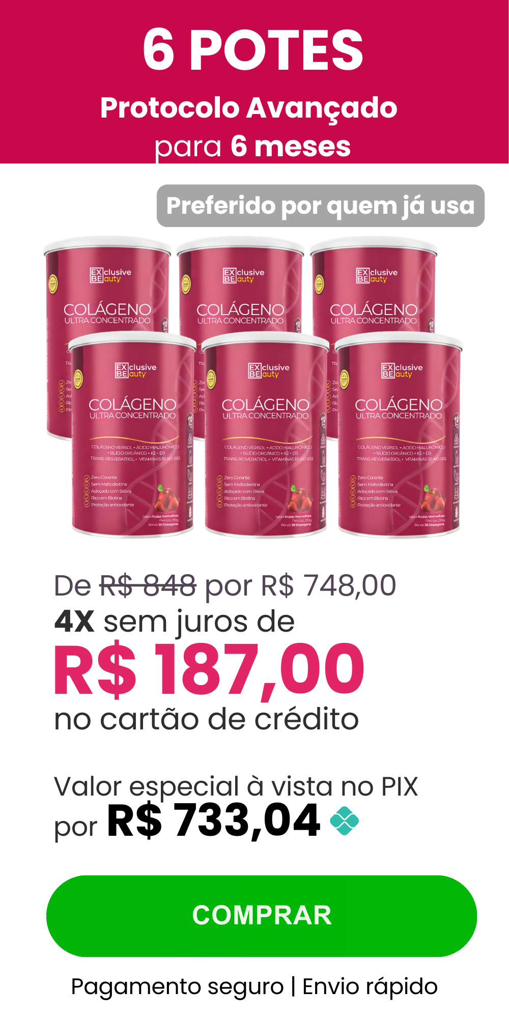 A maioria das marcas oferece apenas 18 doses, com o Exclusive Beauty, você garante 30 dias completos. Somos os únicos que combinam Verisol® + Trans-Resveratrol + K2 + D3 + B12 na mesma fórmula, potencializando resultados e economizando seu dinheiro.