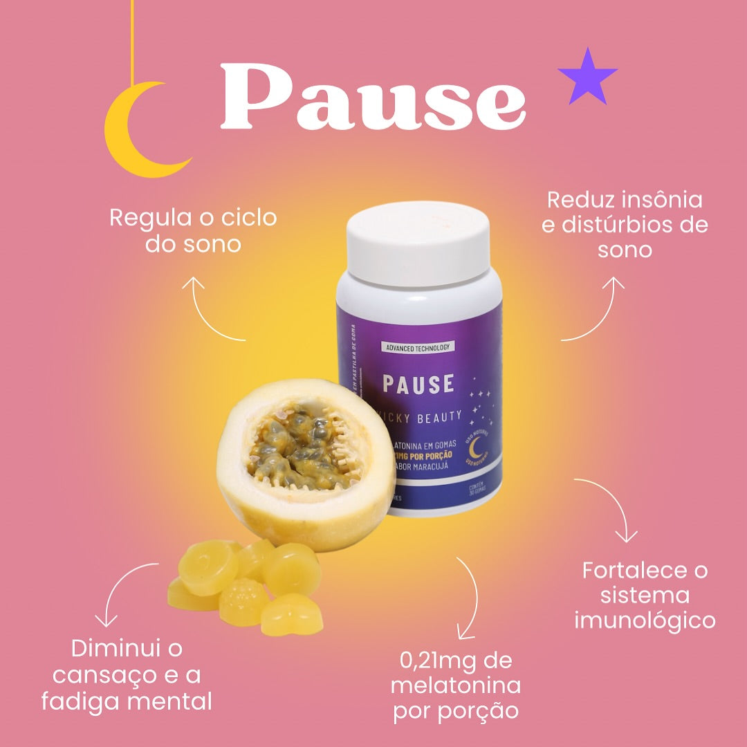 Sem ingredientes artificiais ou desnecessários. Pause é feito com ativos naturais, sem corantes, conservantes agressivos ou substâncias sintéticas — pensado para quem valoriza transparência e saúde.